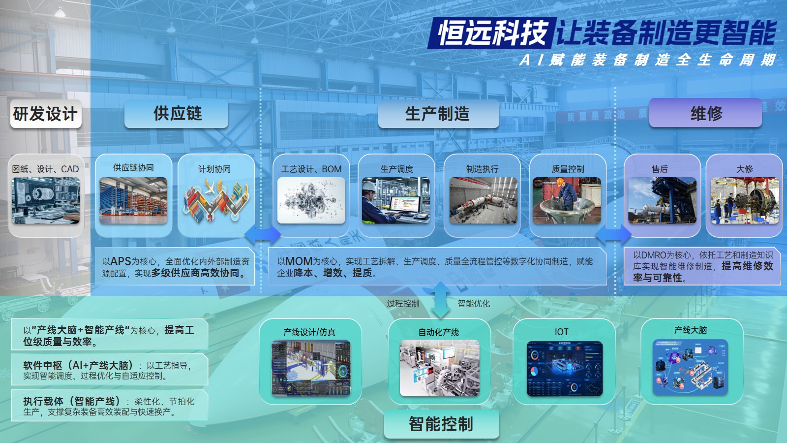 基于智能制造核心能力,恒遠(yuǎn)科技橫向延伸打造裝備全生命周期總集服務(wù),構(gòu)建產(chǎn)業(yè)鏈數(shù)字化協(xié)同平臺與覆蓋設(shè)備大修維護(hù)的全維運(yùn)維保障體系,形成貫穿研發(fā)設(shè)計(jì)、供應(yīng)鏈協(xié)同、生產(chǎn)制造到售后維修的完整價值鏈。